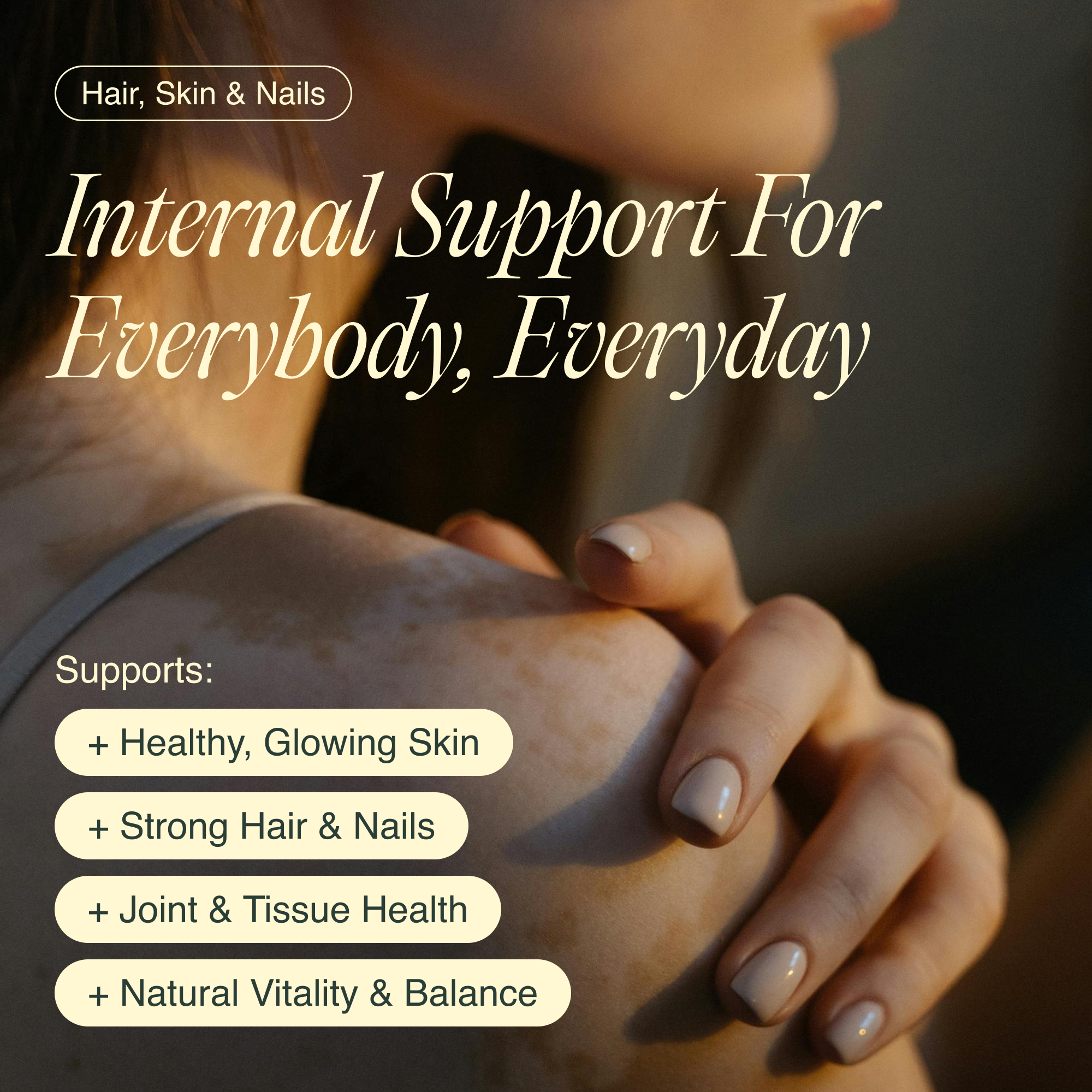Crafted with intention to care for your outer appearance through inner nourishment, this blend supports the health and strength of you hair, skin, nails and musculoskeletal system.*