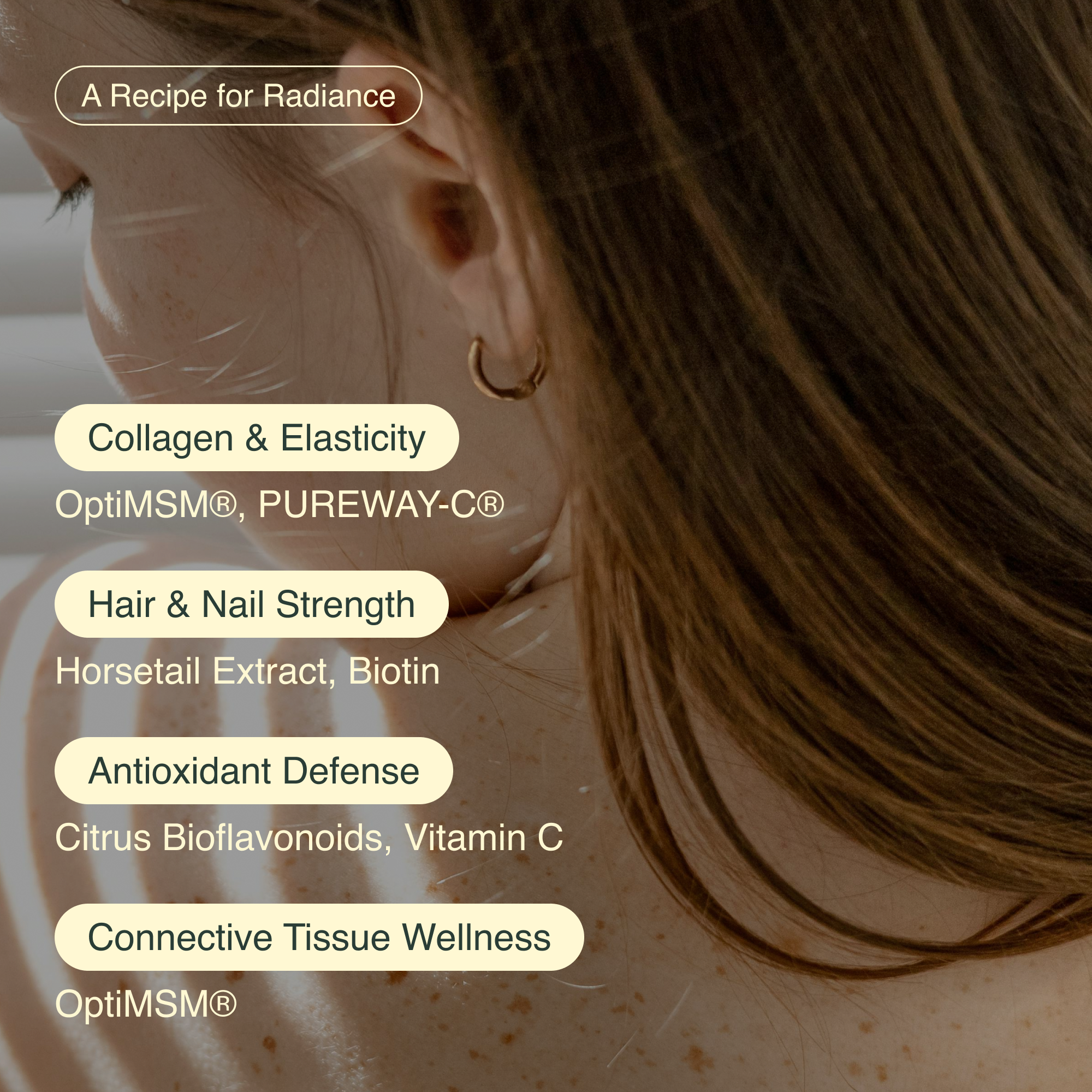 A: OptiMSM® (Methylsulfonylmethane) is an ultra-pure, premium form of organic sulfur, a key nutrient found naturally in the body. It helps support collagen integrity, joint comfort, and healthy skin appearance by nourishing connective tissues and supporting the body’s natural renewal processes.