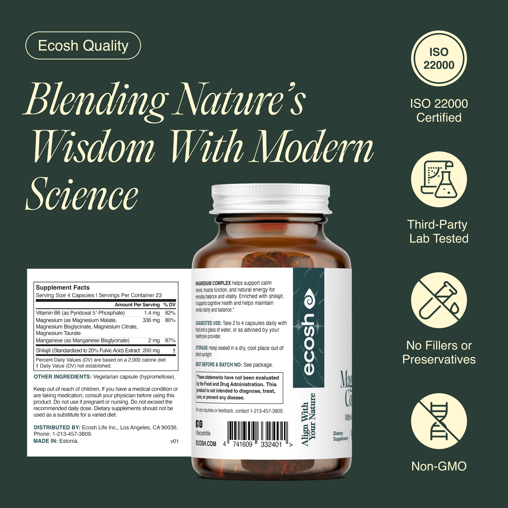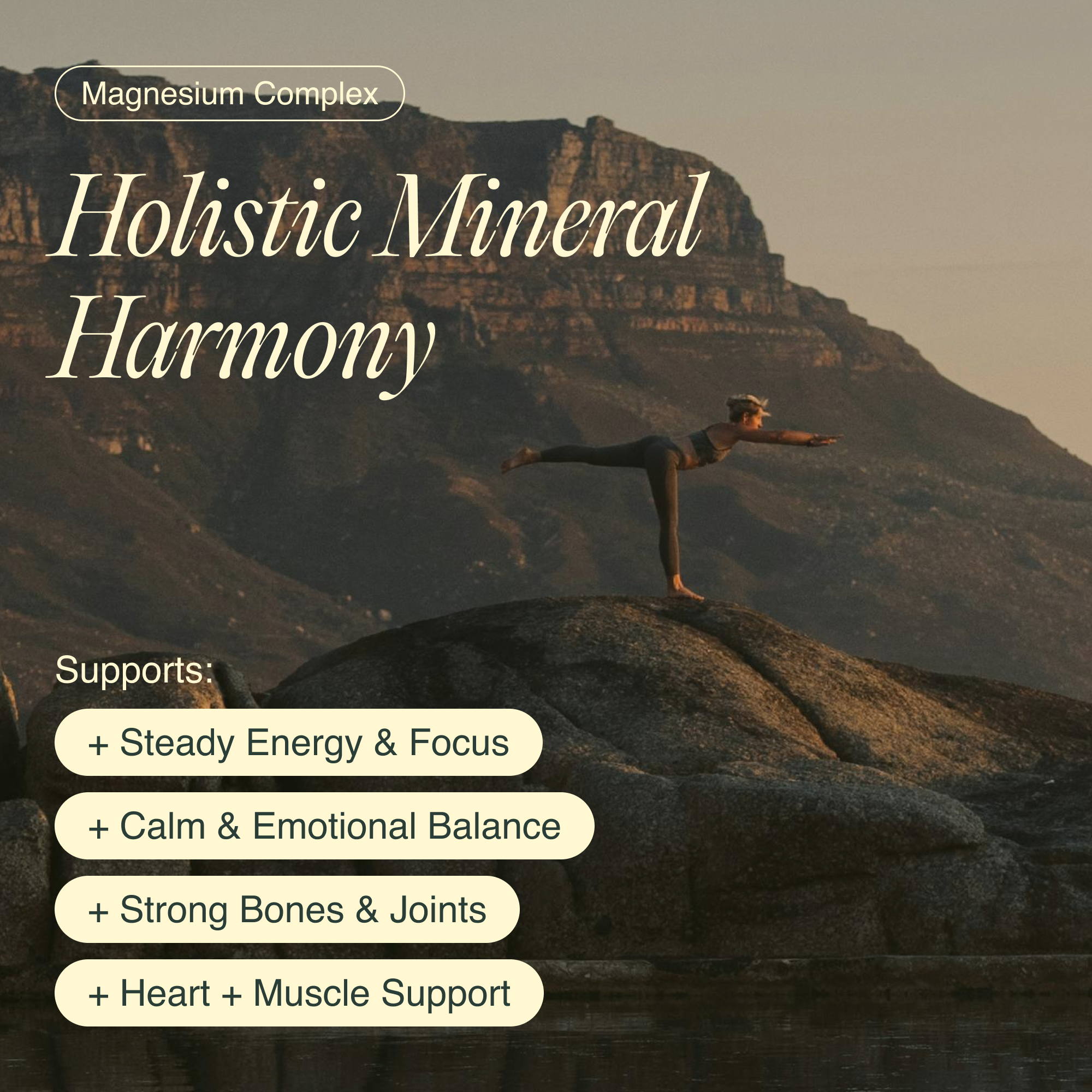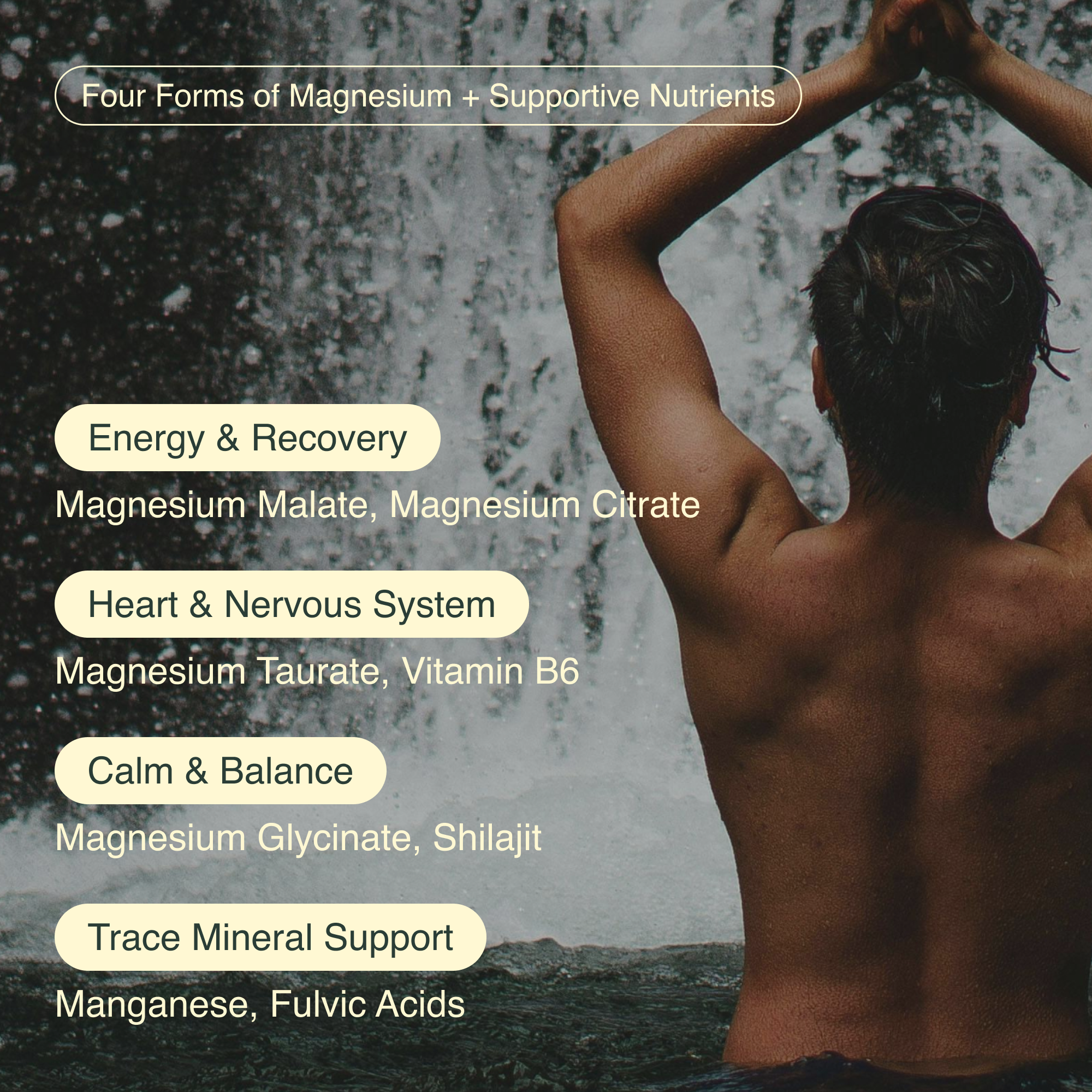 Magnesium Complex combines four different highly bioavailable magnesium forms with Shilajit, an ancient mineral complex, and Vitamin B6, a metabolic essential, for intentional mineral support and efficient absorption.*